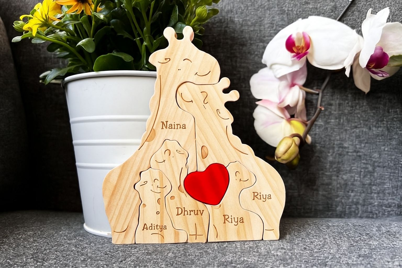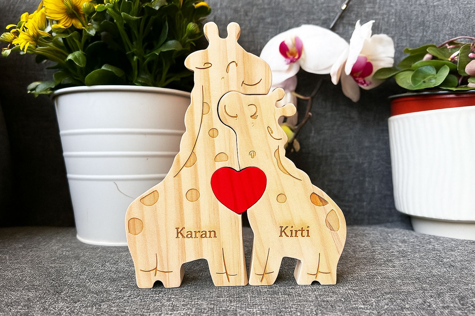 The Wooden Giraffe Family Puzzle Keepsake is a beautifully handcrafted toy that combines educational value with sentimental charm. Made from natural beech wood, this puzzle features a family of giraffes—typically including two parents and a child—each piece smoothly sanded for safe play. Personalization options allow you to engrave names on each giraffe, making it a unique keepsake for occasions like birthdays, baby showers, or family celebrations.